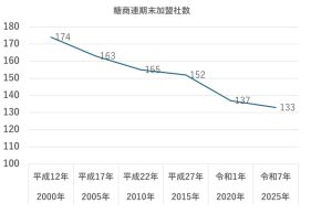一方特約店組合加入数は2000年に174社あったものが2025年3月末時点で133社と41社減少しました。 実に25%の減少です。 特約店の場合、他に資産をお持ちであるケースが多く、2010年ころまでは資産を残しての廃業という形で事業をお止めになるケースが多かったようです。 只、近年の傾向として後継者不足による事業譲渡という形での減少が多いようです。